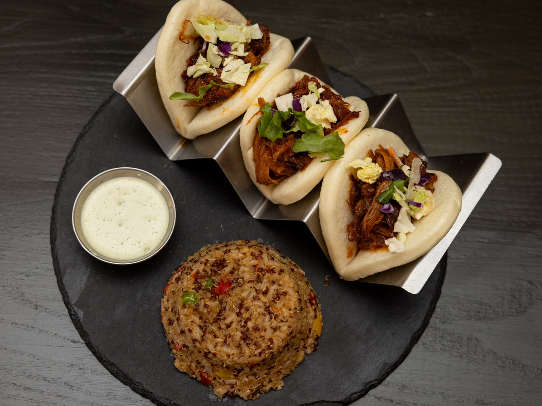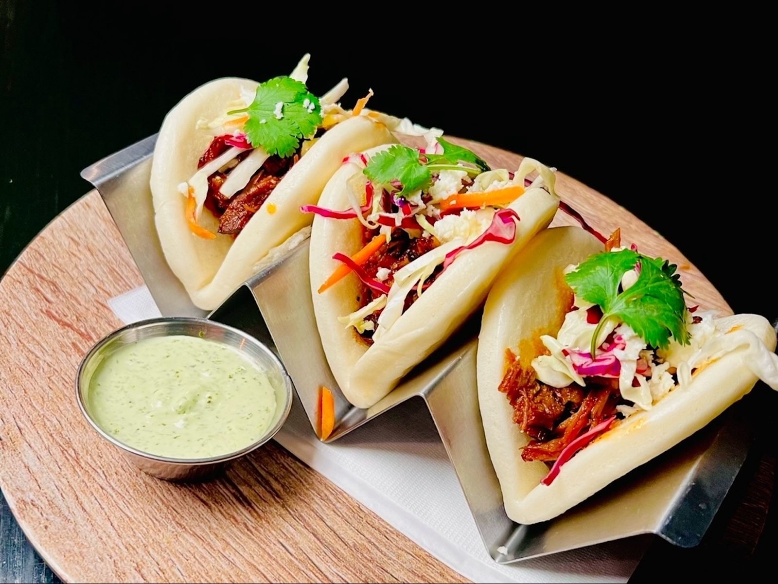 Trio of fluffy bao bins filled with Korean marinated short rib and topped with honey vinaigrette slaw, queso fresco and cilantro. Served with a side of cilantro crema and your choice of side.
