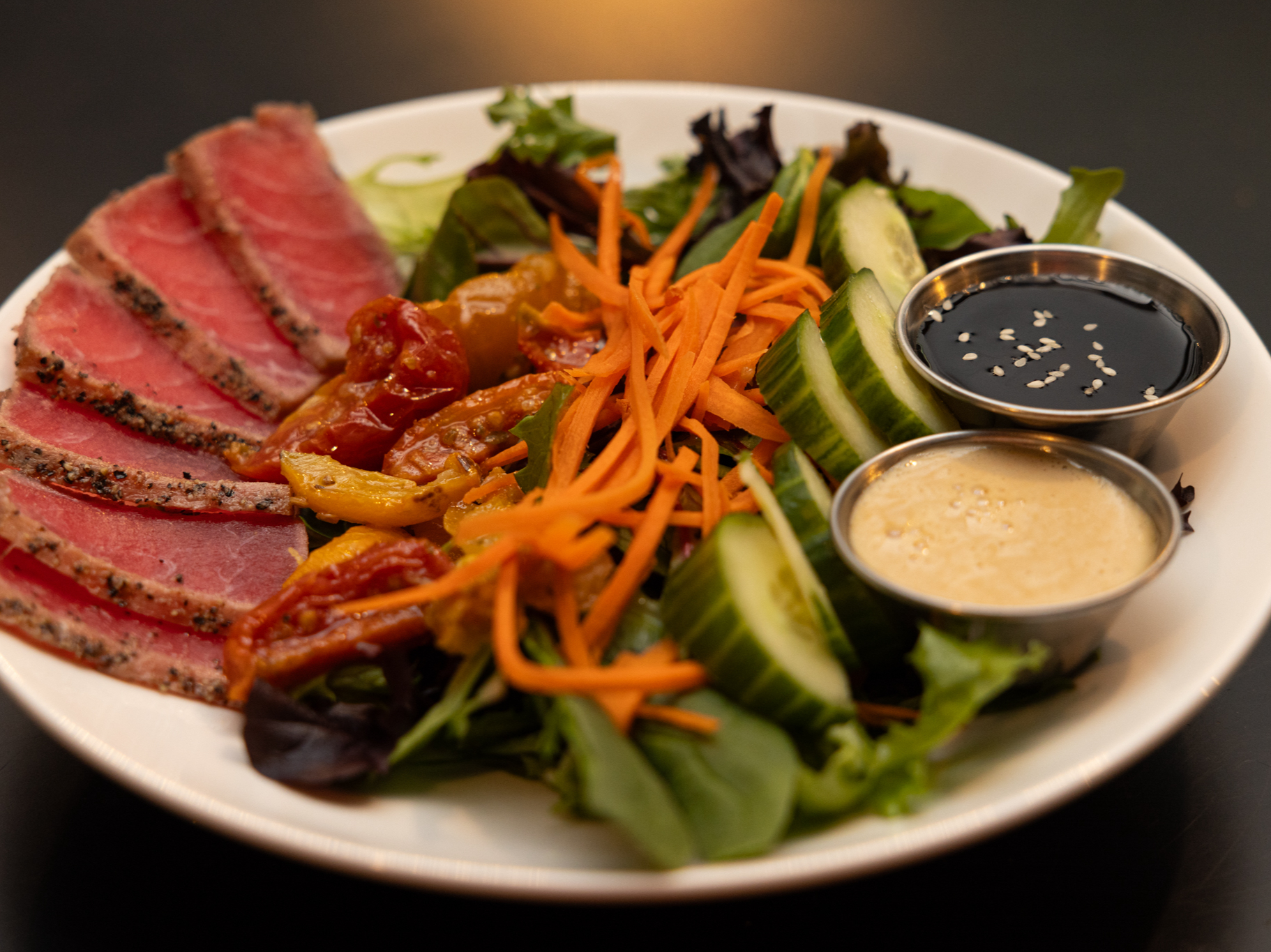 Ahi tuna served with greens, roasted tomatoes & cucumbers. Creamy sesame & honey sesame sauce on the side with a wasabi aioli