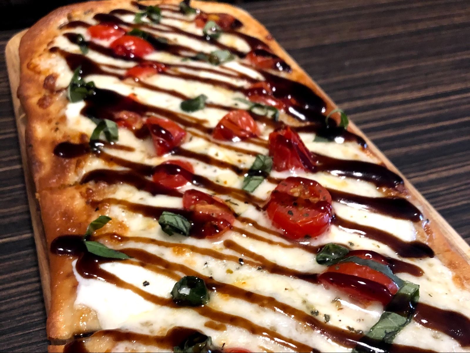 Cheesy olive oil, mozzarella, tomato, basil, balsamic glaze.
