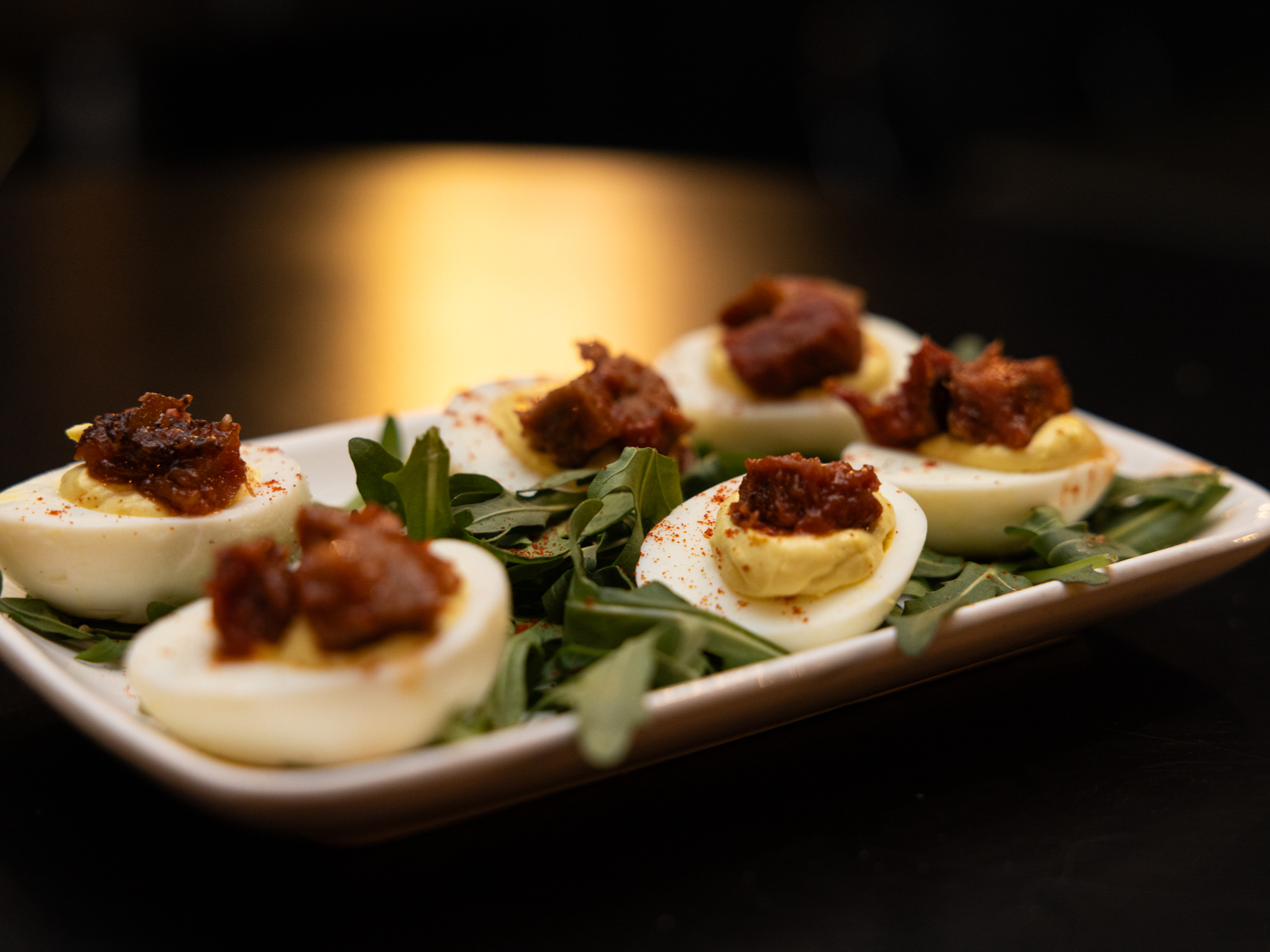 six deviled eggs topped with smoked brisket marinated in our special bourbon BBQ sauce