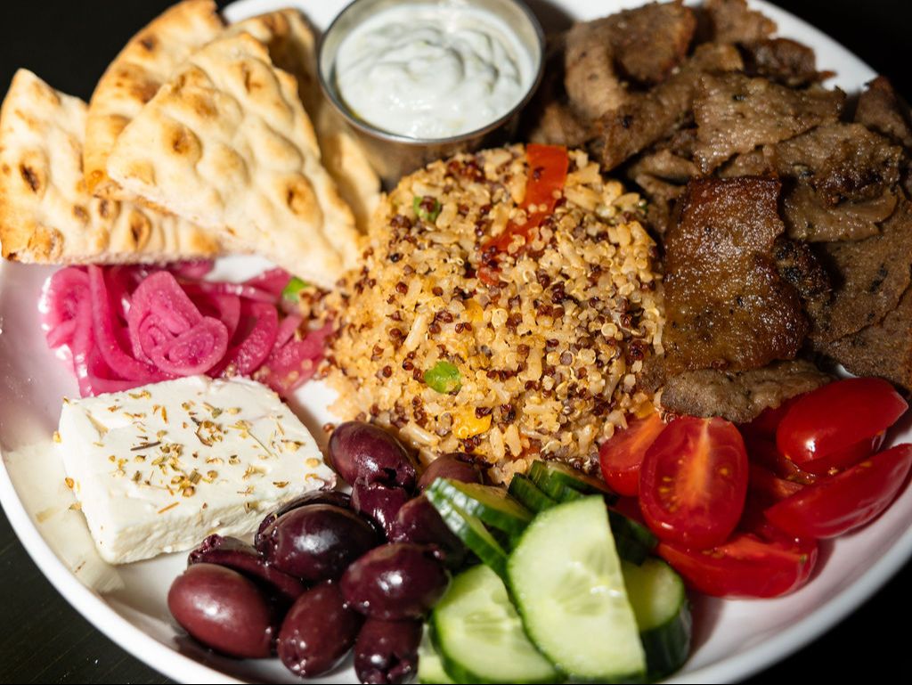 Choice of chicken or gyro meat and rice or quinoa. Served with tomato, pickled red onion, kalamata olives, cucumber, tzatziki sauce and pita bread.