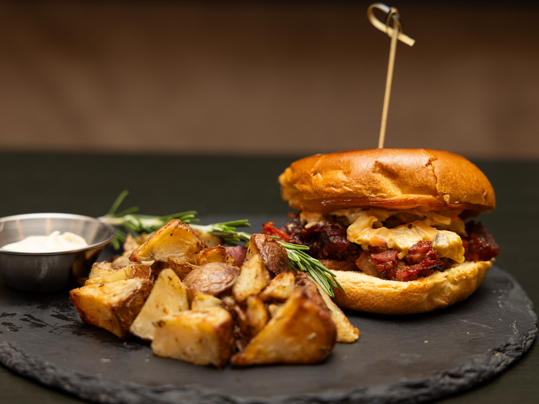 smoked brisket smothered with our house-made bourbon BBQ sauce served on a warm buttered bread and topped with ancho chili and jalapeno slaw. Served with your choice of side.