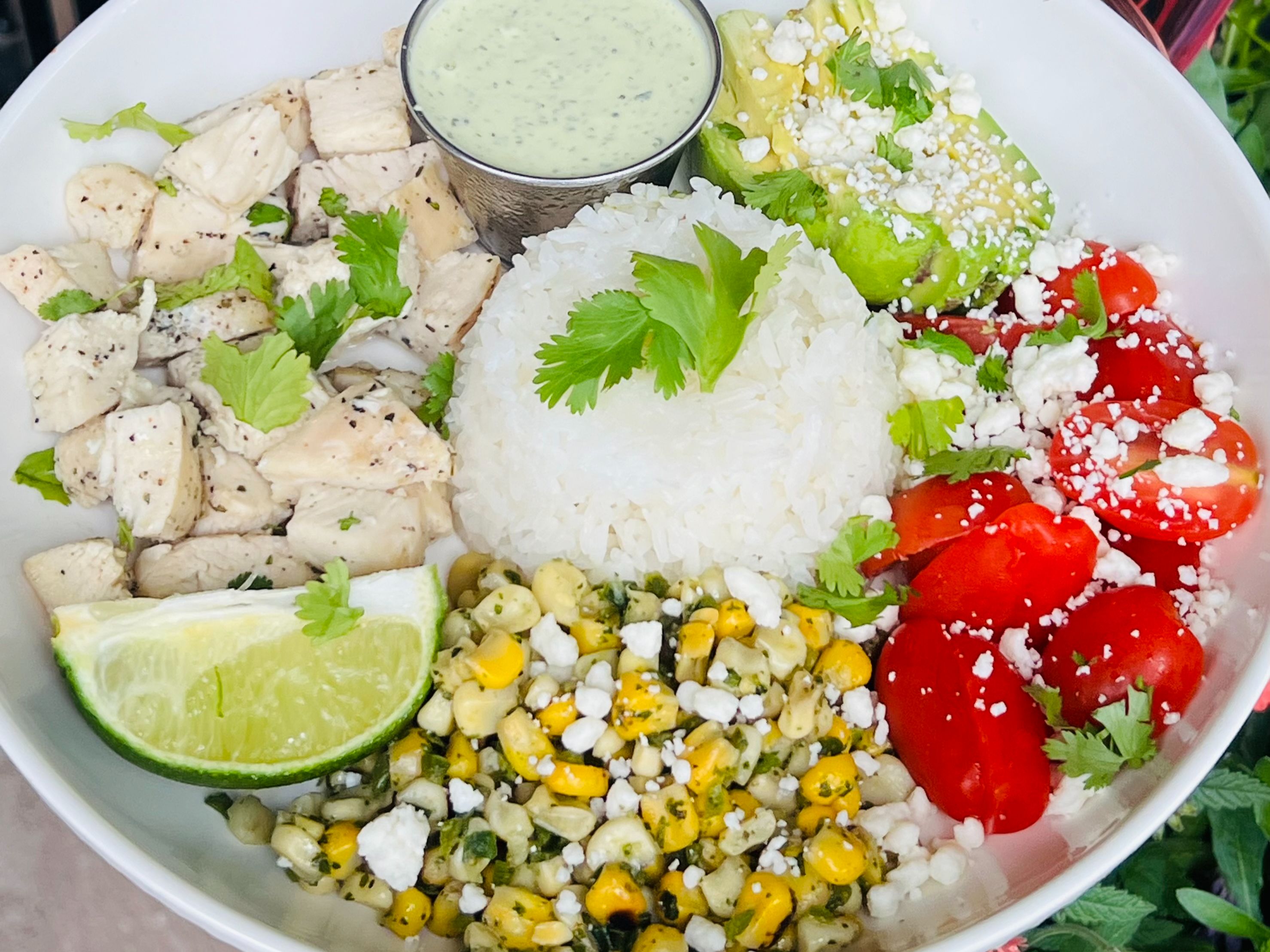Chicken, white rice, corn & jalapeno blend, tomatoes, queso Fresco, cilantro crema sauce, avocado