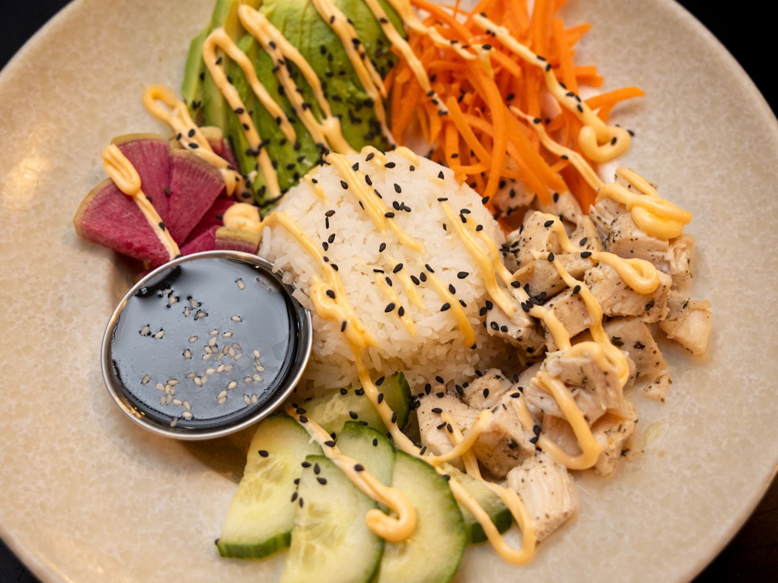 Choice of Ahi Tuna, Short Rib or Chicken served with rice, radishes, cucumbers, shredded carrots, avocado, spicy mayo, sesame seeds. Served with a side of honey sesame soy sauce