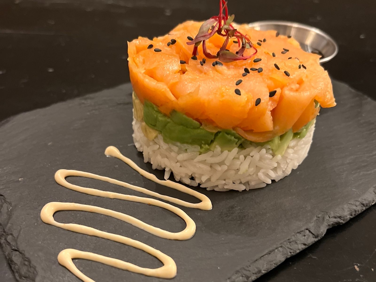 Tower made with three layers that includes sticky jasmine rice, avocado and smoked salmon marinated in Korean sauce and sprinkled with sesame seeds. Served with spicy mayo and honey soy sauce.