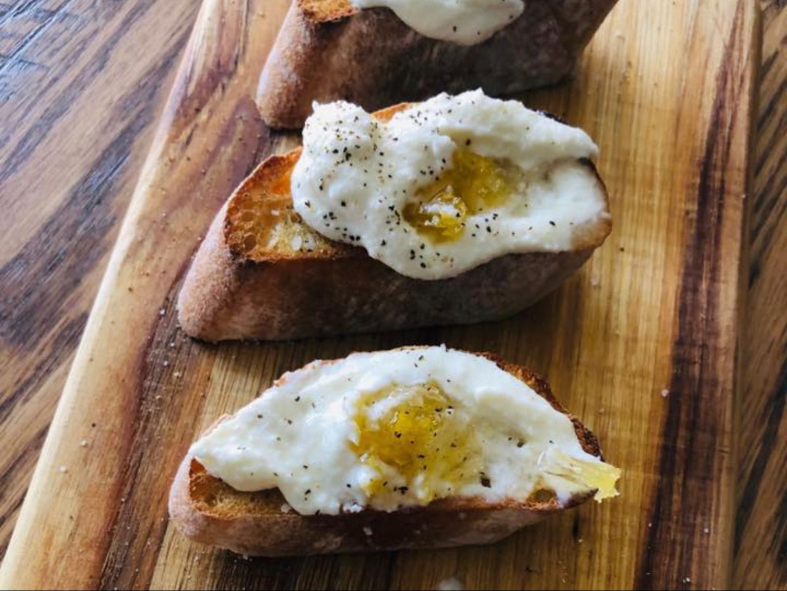 4 crostini toasts topped with whipped ricotta and honeycomb