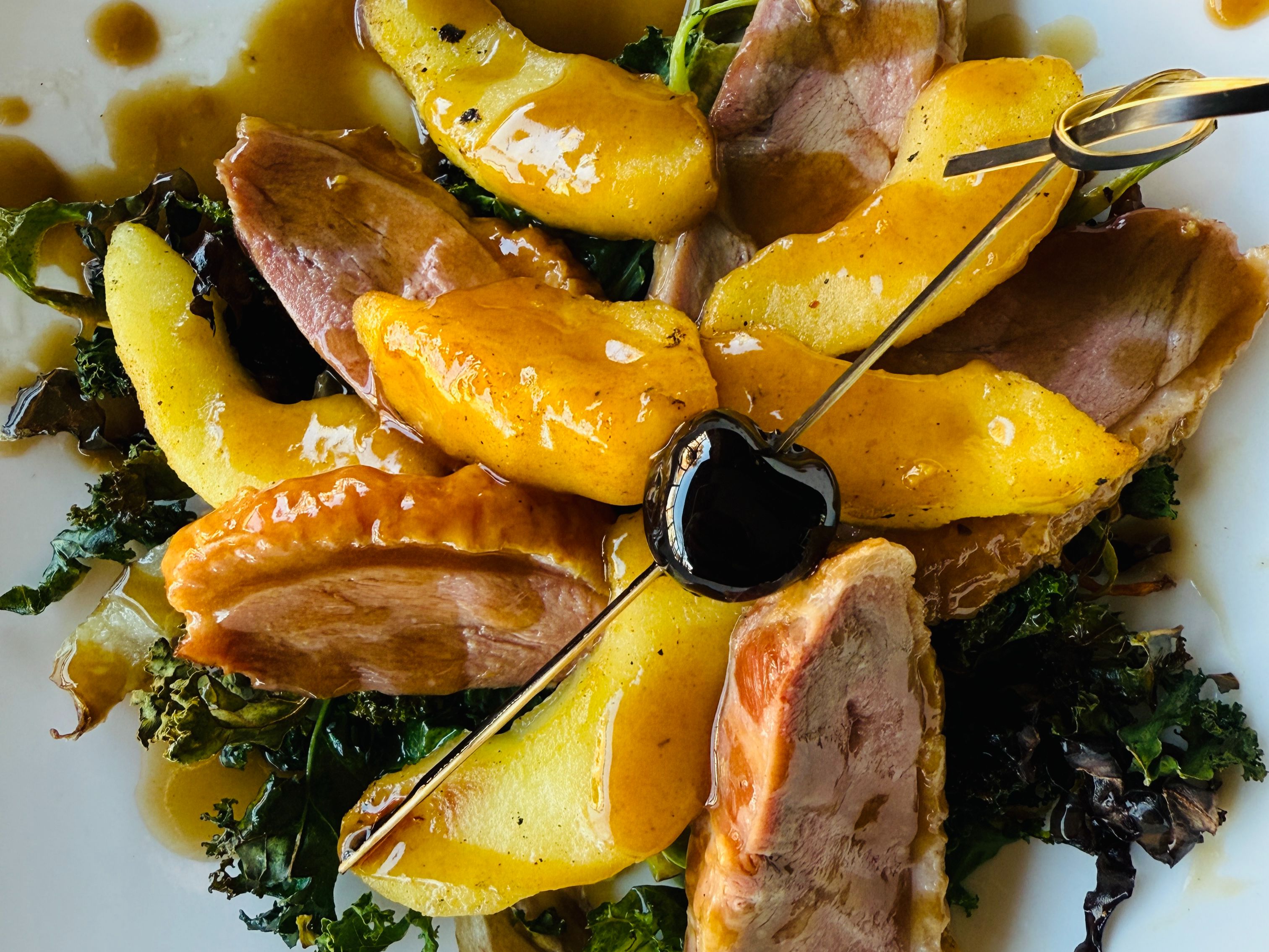 smoked duck served with fuji apples and a manhattan reduction demi glace over a crispy kale veggie blend