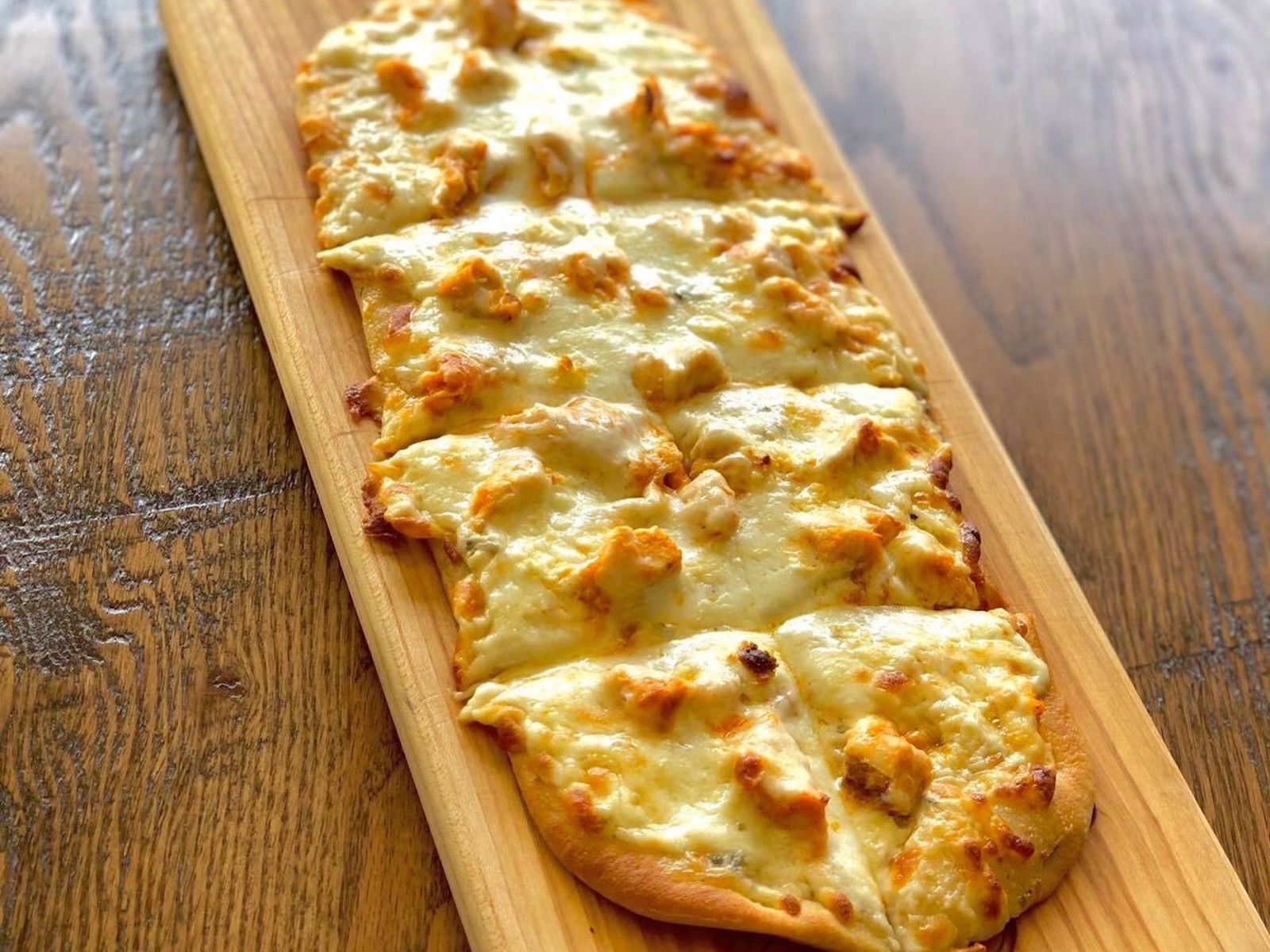 Buffalo chicken, ranch, blue cheese, mozzarella.